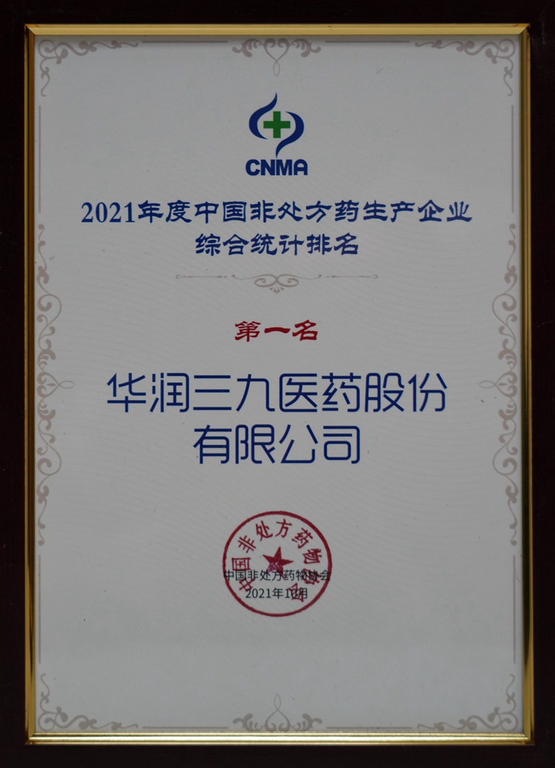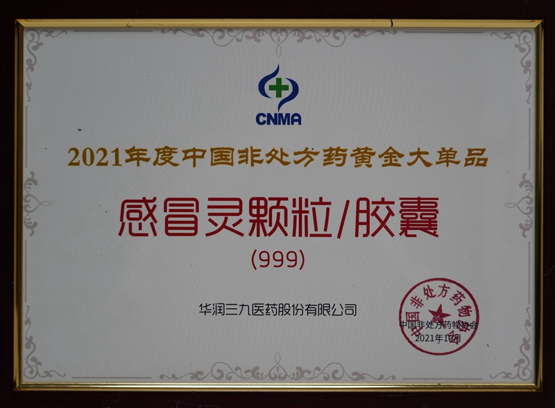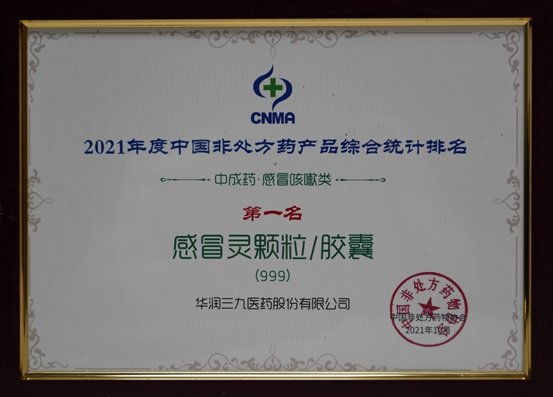 10月18-21日,2021健康中國-首屆中國OTC大會(huì)暨中國中醫(yī)藥促進(jìn)大會(huì)在廣州舉辦。會(huì)上發(fā)布了2021年度中國非處方藥生產(chǎn)企業(yè)綜合統(tǒng)計(jì)排名。華潤三九再次蟬聯(lián)中國非處方藥生產(chǎn)企業(yè)榜首,其中999感冒靈顆粒/膠囊連續(xù)十年榮獲感冒咳嗽類(中成藥)第一名,并入選”2021年度中國非處方藥黃金大單品名單”。