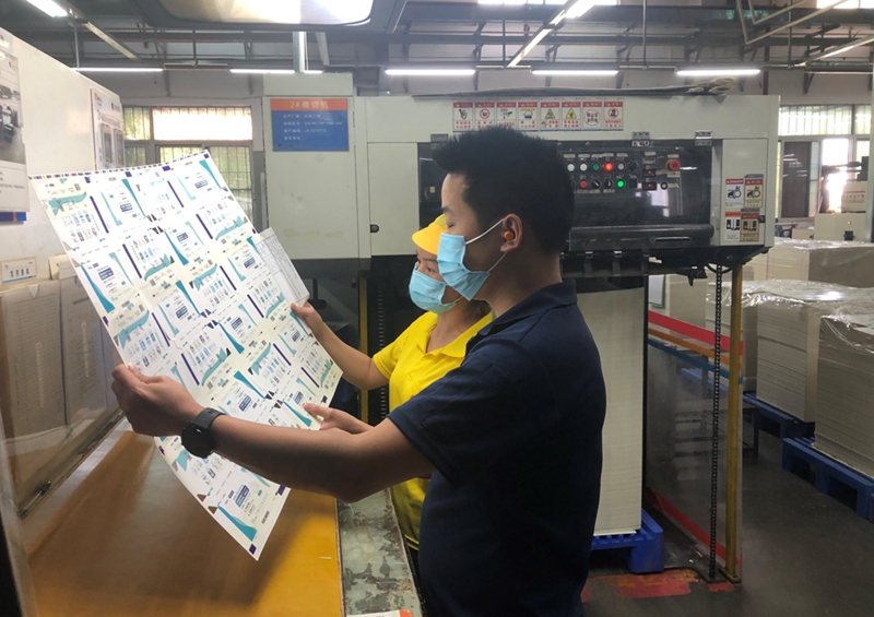 技術(shù)研發(fā)部緊急制作和客戶確認(rèn)產(chǎn)品文件和生產(chǎn)作業(yè)單,采購部協(xié)調(diào)紙張、膠膜、紙箱等物料快速到位,生產(chǎn)系統(tǒng)統(tǒng)籌協(xié)調(diào)規(guī)劃產(chǎn)線。24日晚,前期文件等準(zhǔn)備工作和材料全部到位。25日早8點(diǎn),客戶到公司車間機(jī)印刷現(xiàn)場(chǎng)確定顏色,9點(diǎn)半簽樣完成,2臺(tái)印刷機(jī)高速生產(chǎn)。