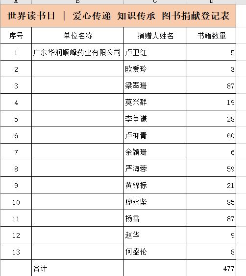 2023年4月13日世界讀書日,我公司響應(yīng)華潤三九倡議開展“愛心傳遞 知識傳承閑置圖書募捐活動“,積極履行社會責(zé)任。截止至18日,行政管理部共收到來自莫興群等13位同事的愛心書籍捐贈共477本。