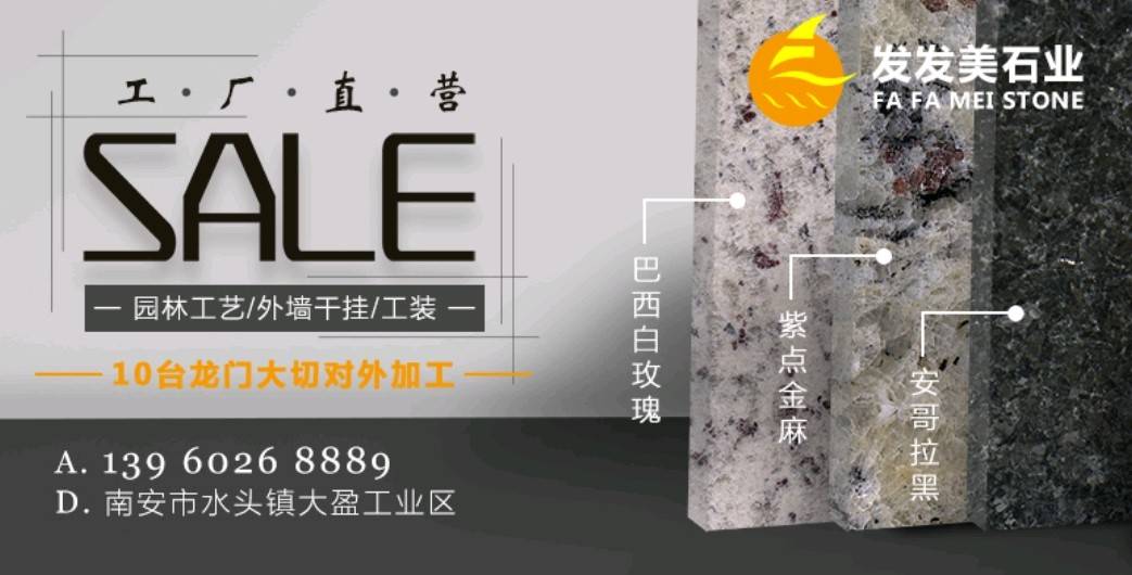 南安發(fā)發(fā)美石雕工藝品有限公司位于324國道邊大盈工業(yè)區(qū),生產(chǎn)各種進口花崗巖,公司擁有10臺龍門切,全自動磨機,5臺紅外線,承接各種出口花崗巖成品板,條板,歡迎洽談。