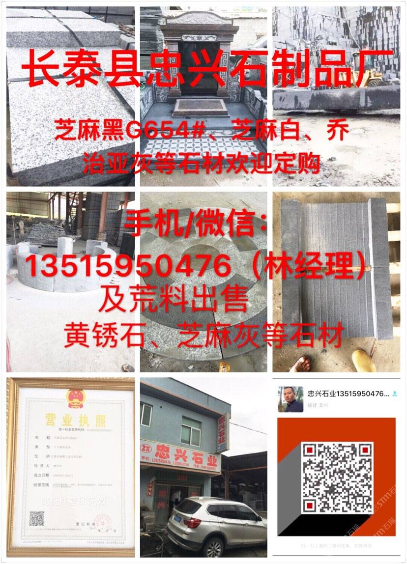【長泰縣忠興石制品廠】礦區(qū)直銷、誠信經(jīng)營。(正常規(guī)格全部特價處理)專注:園林、市政工程.異形..別墅.荔枝面、火燒面、仿中國黑、墓碑石、荒料礦山直銷:G654芝麻黑 、G655芝麻灰 、黃銹石等。 我廠離廈門機(jī)場(50公里);距離高鐵廈門北站(40公里)導(dǎo)航地址:(長泰縣忠興石制品廠)地址:福建省長泰縣林墩美宮工業(yè)區(qū)。 電話/微信號:13515950476林經(jīng)理[握手] 歡迎到工廠考察、誠信服務(wù),合作互利,感恩有你!