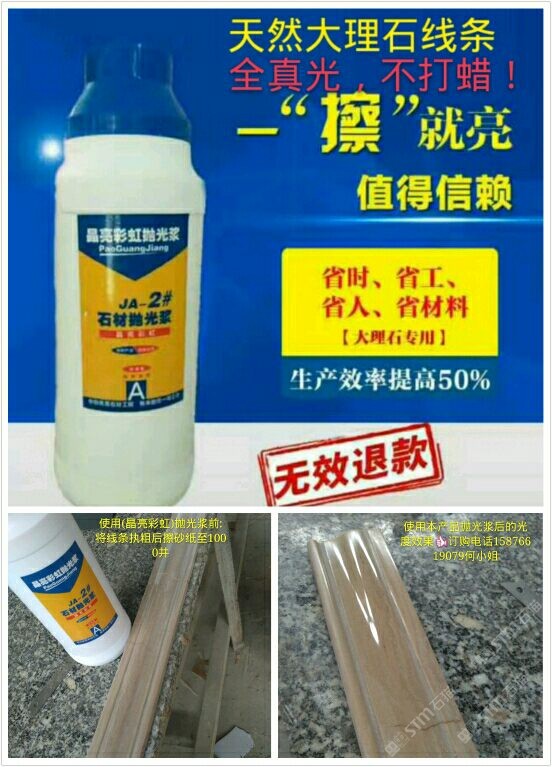 (晶亮彩虹拋光漿)為配方調制。從2016年5月份開始靠著技術員親自逐間上門到云浮多家石材工藝廠施展產品使用技術和試驗產品光度效果取得了各家老板和工藝師們的稱贊和認可,通過短短一年的時間品牌:晶亮彩虹拋光漿全國省地已約2000家石材廠正在使用,市場反應效果顯注,現(xiàn)面向全國誠招代理商。客服熱線:15876619079