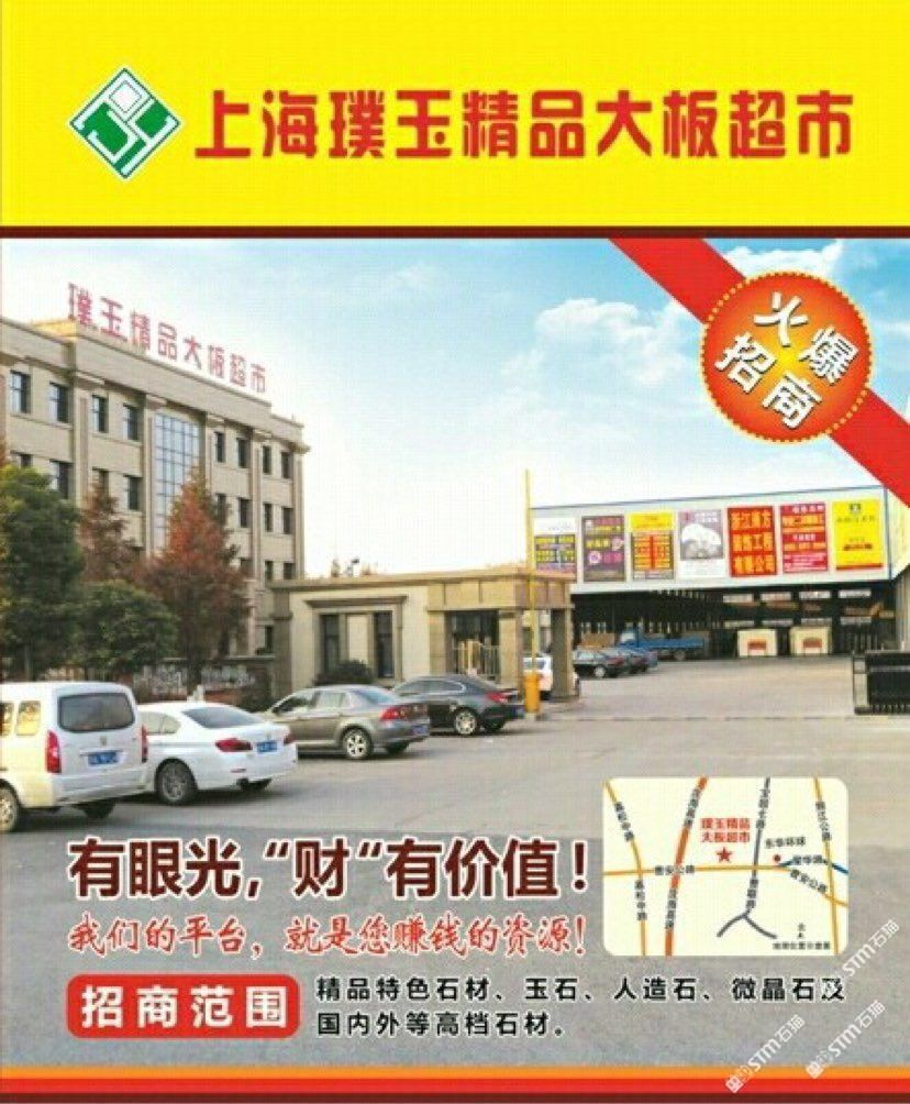 璞玉石材市場(chǎng) 上海璞玉精品大板超市位于上海市曹安公路石材聚集區(qū)黃金地段,旨在打造曹安公路標(biāo)準(zhǔn)化,高品質(zhì)的大板展示車間及配套完善的石材交易平臺(tái)。 目前對(duì)外招商,招商范圍:精品,特色石材,玉石,人造石,微晶石及國(guó)內(nèi)外等高檔石材。 ?自2015年8月份正式招商至今,現(xiàn)已入住企業(yè),(排名按字母排序): ?奧戈石業(yè),博聞石業(yè),寶源石業(yè),馳譽(yù)石業(yè),橙石石材,福樂商貿(mào),富邦國(guó)源石業(yè)?,谷源貿(mào)易,觀諾石英石,和珞石業(yè),慧亞石業(yè),華屹石業(yè),翰祥壁爐,金仕德石業(yè),集龍石業(yè),瑾浩石業(yè),江淮貿(mào)易,嘉士白石業(yè)巨鼎石材,覺峰石業(yè),佳聯(lián)石材 凱潤(rùn)石材,?凱石石線 立坤石業(yè) 明恩石業(yè) 南輝大理石,榮捷石業(yè), ?生磊石業(yè) ?五洲石業(yè),?萬利成石業(yè) 新華輝石業(yè),欣錦石業(yè),霞云石業(yè),新源輝石業(yè),新昌石雕,巖靈石業(yè),亞欣石業(yè),億成石業(yè), 眾磊石業(yè),?擇磊石業(yè)