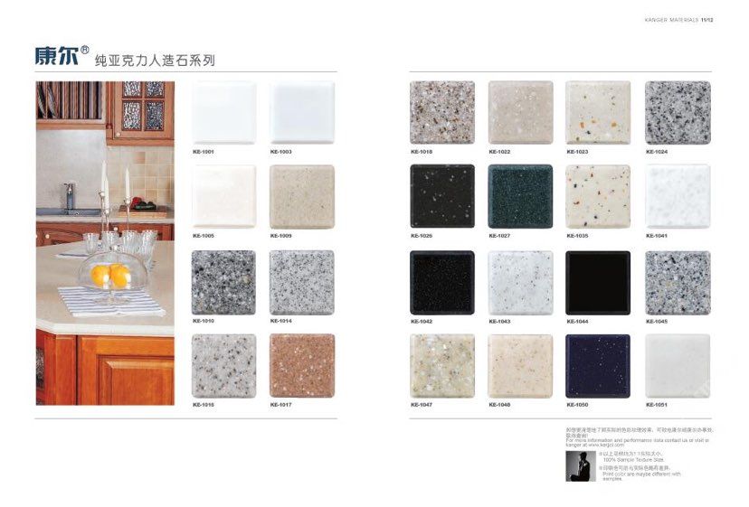 康爾人先后開發(fā)出了色彩豐富的 100% 純亞克力系列,復(fù)合亞克力系列,不飽和樹脂系列,石英石、集成成品臺面和高分子復(fù)合材料門板系列。產(chǎn)品系列多樣、顏色豐富、品質(zhì)穩(wěn)定、已銷往世界幾十個國家,深受國內(nèi)外客戶的好評.