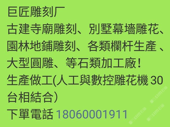 5年專業(yè)石業(yè)雕刻加工,寺廟古建、幕墻建材、園林欄桿,等石材雕刻類加工。歡迎洽談合作!有意直接電話!微聊長時間沒登