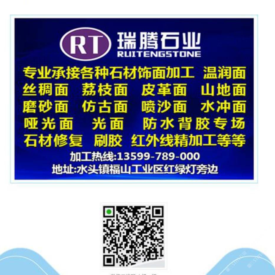 專(zhuān)業(yè)承接各種石材飾面加工,溫潤(rùn)面,荔枝面,仿古面,剁斧面,啞光面,專(zhuān)業(yè)石材防水背膠等等,20頭靖佑自動(dòng)磨對(duì)外加工,聯(lián)系電話(huà)13599789000