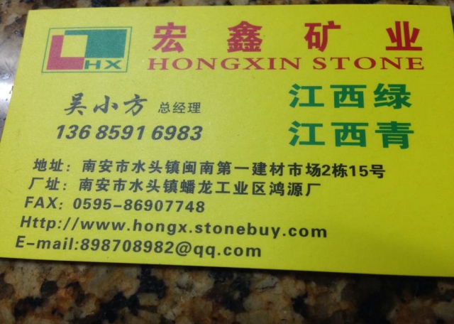 宏鑫礦業(yè) 聯(lián)系人:吳先生    136****6983 查看 手機號碼:無 主營范圍: 大板批發(fā)、 企業(yè)地址:福建南安閩南建材市場2棟15號
