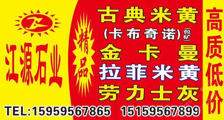 發(fā)布信息: 【江源石業(yè)】超大量 1??金卡曼 2??古典米黃&卡布奇諾 3??拉菲米黃&新莎安娜、 4??勞力士灰、5??西西里灰… 業(yè)務銷售點??: ??澳盛大板市場8棟1-4區(qū) ??濱海中閩市場9通道79區(qū)