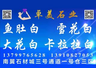 南安市水頭鎮(zhèn)卓美石材主營產(chǎn)品:魚肚白,魚肚白1,雪花白,雪花白2,雪花白3,卡拉拉白,卡拉拉白1,卡拉拉白3,中花白(細(xì)花),魚肚白大板,魚肚白(灰黑紋),魚肚白小板企業(yè)地址:福建泉州南安市水頭鎮(zhèn)東升3通道D1-1