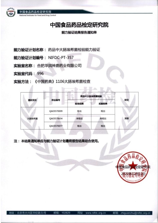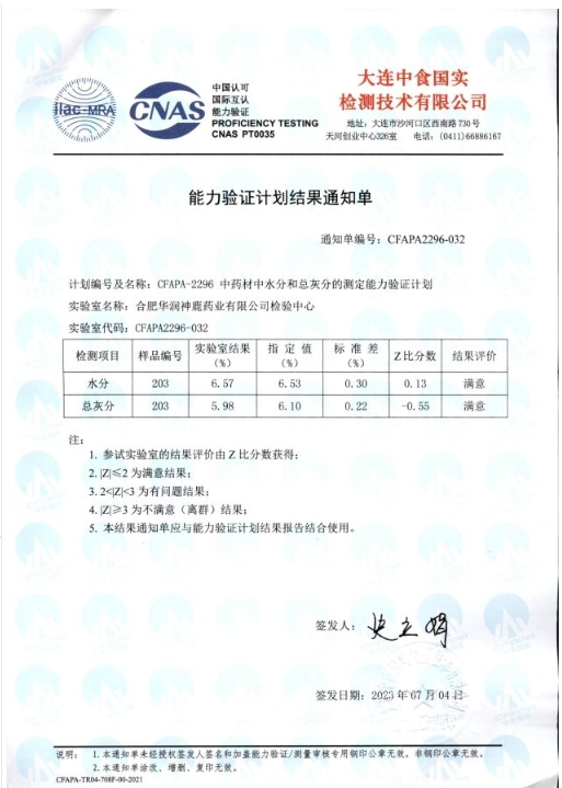 近日,在中國(guó)食品藥品檢定研究院公布的2023年的能力驗(yàn)證計(jì)劃報(bào)告中,華潤(rùn)神鹿檢驗(yàn)中心參加的“藥品中霉菌和酵母菌總數(shù)計(jì)數(shù)能力驗(yàn)證(NIFDC-PT-446)”及“藥品的比旋度測(cè)定能力驗(yàn)證(NIFDC-PT-406)”分別榮獲滿意證書。大連中食國(guó)實(shí)檢測(cè)技術(shù)有限公司公布的2023年的能力驗(yàn)證計(jì)劃報(bào)告中,華潤(rùn)神鹿檢驗(yàn)中心參加的“中藥材中水分和總灰分的測(cè)定能力驗(yàn)證(CFAJPA-2296)”同樣榮獲滿意證書。上述四項(xiàng)滿意證書的獲得,標(biāo)志著2023年華潤(rùn)神鹿檢驗(yàn)中心參加上述能力驗(yàn)證項(xiàng)目全部通過,并連續(xù)5年通過能力驗(yàn)證。